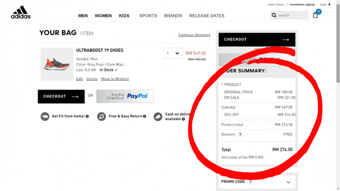 Harga Adidas Ultra Boost adalah RM780, namun selepas diberikan diskaun, ia menjadi RM274.50 di laman web rasmi Adidas Malaysia.