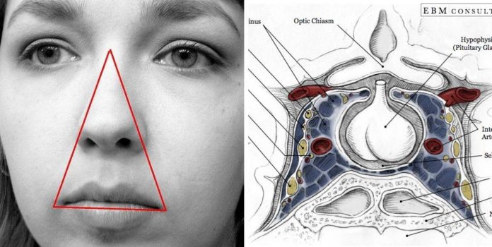 Segitiga ini bermula daripada pangkal hidung dan ia membawa kepada hujung bahagian mulut. Kesemua kawasan ini akan membawa darah terus ke satu kawasan yang dinamakan sebagai Cavernous Sinus.