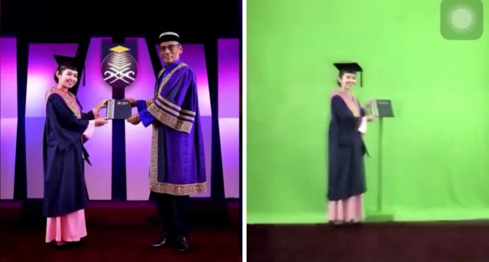 Terbaru, UiTM keluarkan idea yang menarik dengan mengadakan majlis dilakukan secara temu janji serta menggunakan teknologi skrin hijau.