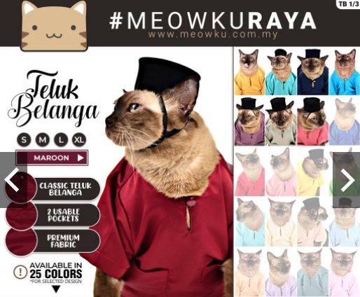 Bagi si pemilik kucing, korang boleh membeli baju raya untuk haiwan peliharaan ini yang dijual secara online. Jangan tak percaya, ada banyak rekaan yang cantik untuk si bulus melaram di pagi raya.