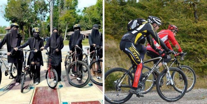 Dapat dilihat jersi dipakai lelaki ada kalanya tidak menutup lutut saat berkayuh. Baca perkongsian dari Ustaz Syed Syahridzan Ben Agil mengenai pakaian sukan ketat. Mungkin ramai tak sangka, lelaki yang berpakaian ketat boleh jatuh haram kerana mendedahkan diri kepada fitnah yang berbahaya.