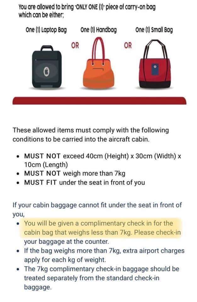 Ya, garis panduan baru ya. Di mana saiz beg yang korang nak bawa naik ke atas pesawat adalah bersaiz 40cm (ketinggian) x 30cm (lebar) x 10cm (panjang). Beratnya pun tak lebih 7 kg dan boleh dimuatkan di bawah tempat duduk hadapan sahaja.