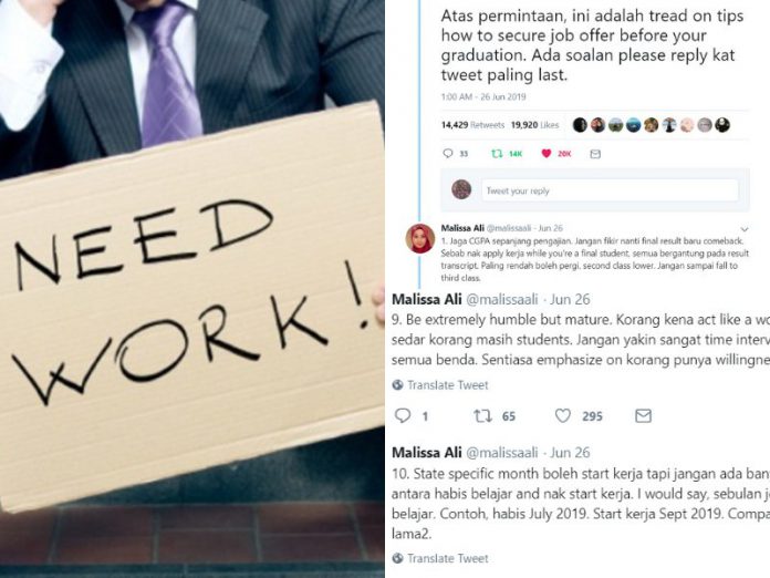 Susulan itu, seorang wanita yang dikenali sebagai Malissa Ali berkongsi di laman Twitternya mengenai tip-tip untuk mendapatkan pekerjaan dengan cepat sebelum tamat pengajian.