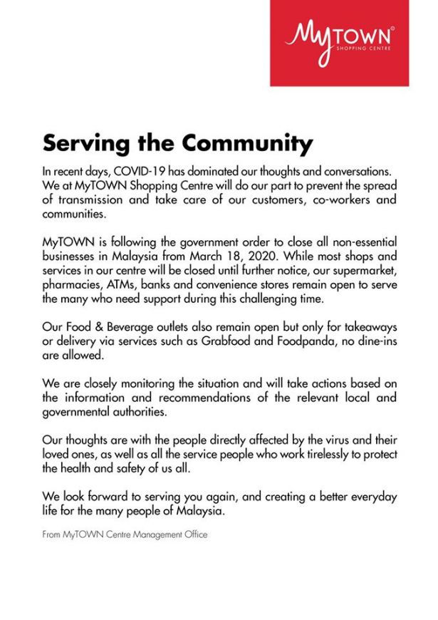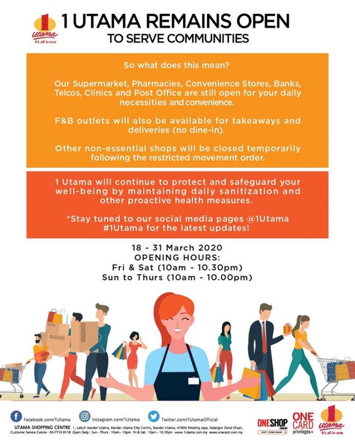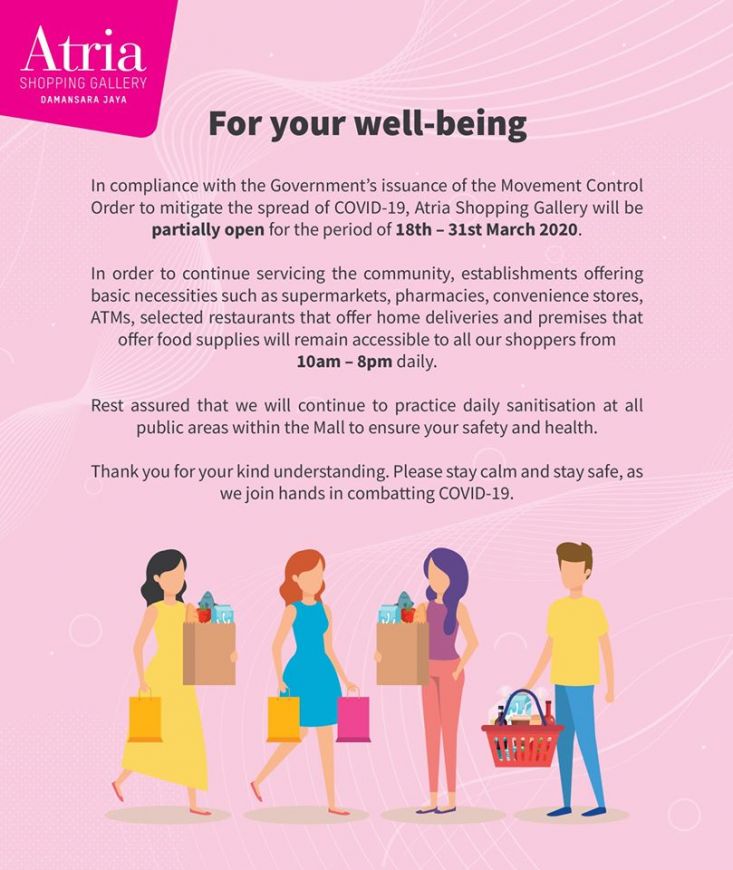 Pusat beli-belah ini dibuka hanya untuk operasi di pasar raya, kedai serbaneka dan perkhidmatan penting sahaja.