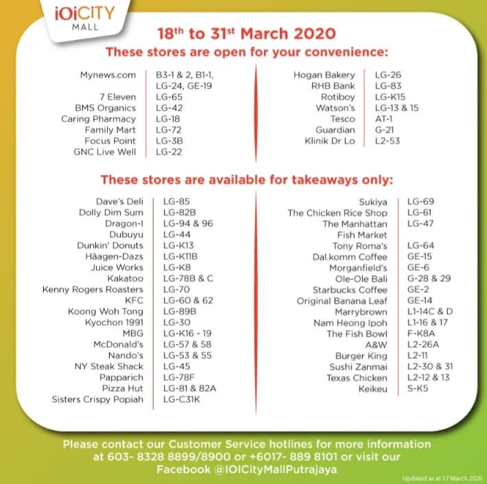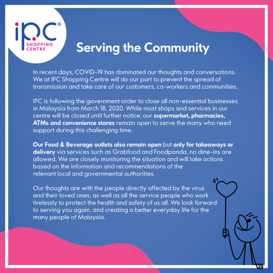 Kebanyakan kedai akan ditutup di IPC, kecuali untuk perkhidmatan penting seperti farmasi, pasaraya, ATM, dan kedai serbaneka.