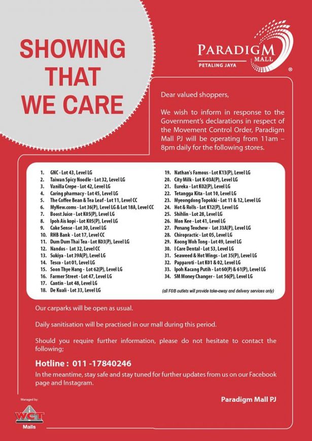 Sepanjang tempoh 14 hari Perintah Sekatan Pergerakan ini, Paradigm Mall akan beroperasi dengan waktu yang baru iaitu dari pukul 11 pagi hingga 8 malam sahaja untuk kedai-kedai terpilih yang dibenarkan.
