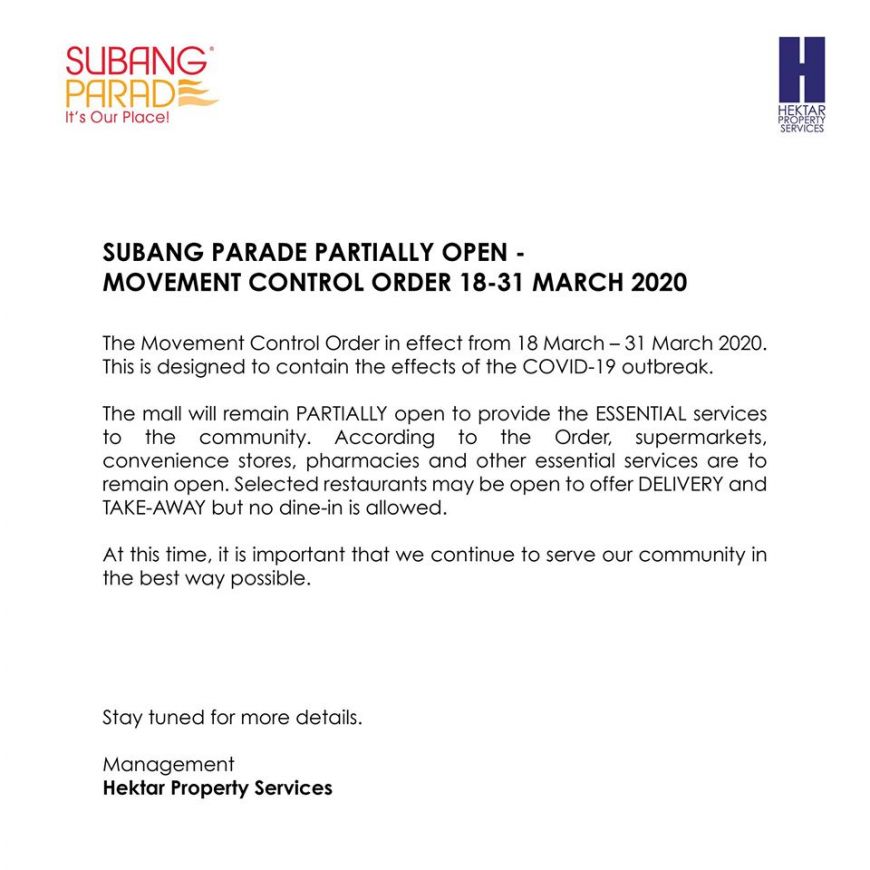 Subang Parade juga masih dibuka hanya untuk pasar raya, farmasi dan kedai serbaneka.