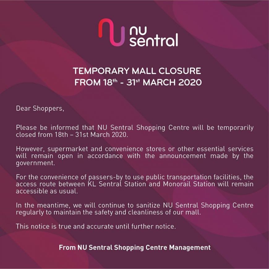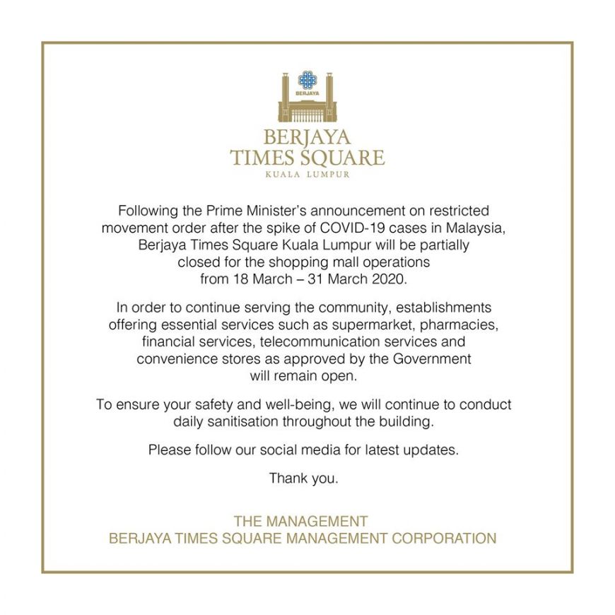 Bermula hari ini hingga 31 Mac, semua kedai di Suria KLCC tidak akan dibuka untuk kunjungan orang ramai melainkan beberapa kedai penting yang dibenarkan.