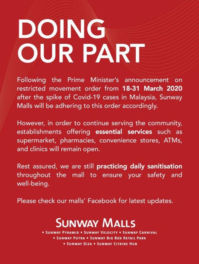 Kedai serbaneka, klinik, mesin ATM, dan pasar raya antara perkhidmatan penting lain yang akan tetap dibuka dan beroperasi seperti biasa di kesemua cawangan pusat membeli-belah di bawah Kumpulan Sunway.