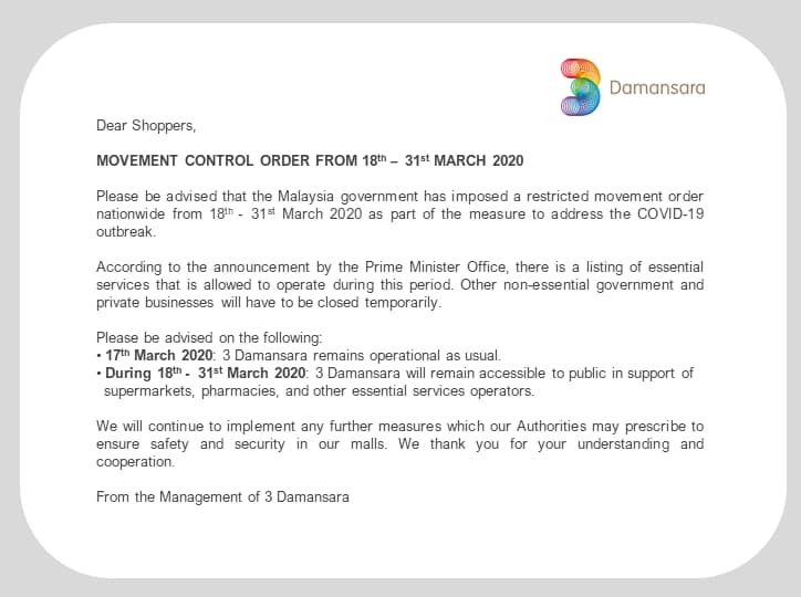 Perkhidmatan yang tidak diperlukan dan perniagaan swasta akan ditutup buat sementara waktu di 3 Damansara, Petaling Jaya ini.