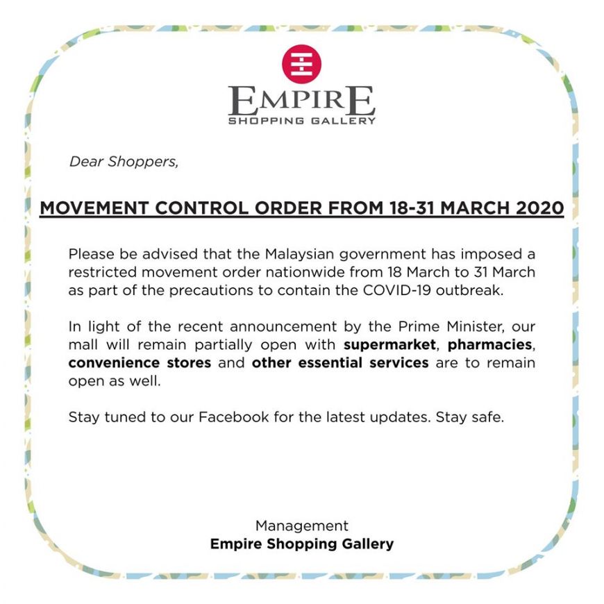 Pusat membeli-belah Empire akan dibuka seperti biasa tetapi hanya melibatkan operasi di pasar raya, farmasi, kedai serbaneka dan perkhidmatan penting sahaja.