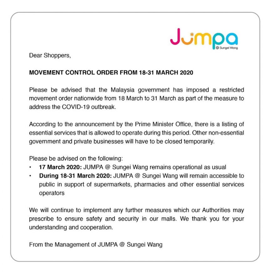 Perniagaan swasta di Jumpa @ Sungei Wang tidak akan dibuka buat sementara waktu, bagaimanapun operasi di pasar raya, farmasi dan perkhidmatan penting lain akan terus dibuka untuk orang ramai.