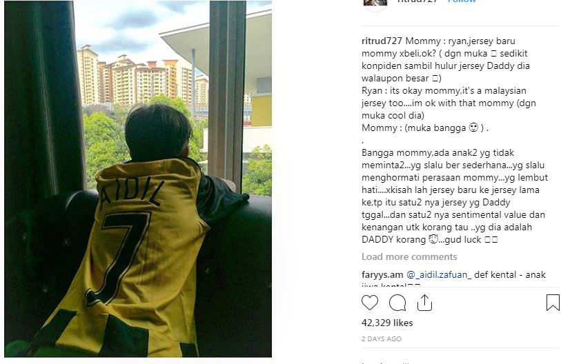 Tak hairanlah, posting Rita Rudaini yang tular semalam bagaimana anak sulungnya memakai satu-satunya jersi tertulis nama Aidil dan nombor keramatnya semasa perlawanan separuh akhir Piala AFF Suzuki yang menyaksikan Malaysia dan Thailand seri dengan keputusan 0-0. Pasti sayu bagi yang faham “nilai rindu seorang anak” yang mungkin sudah lama tidak bertemu bapa kandung mereka. Tapi dari post berkenaan juga ada sesetengah netizen yang memberikan jawapan menyakitkan hati.