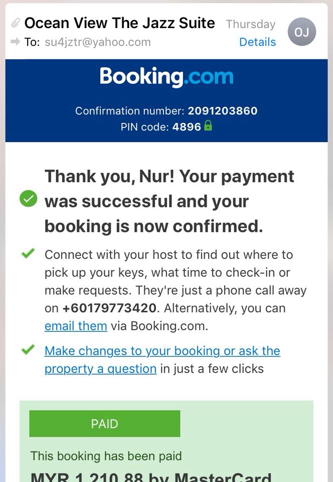 Lepas book apartment ‘Jazz Suite’ ni, semuanya OK. Dapat email confirmkan dan pembayaran pun dah dibuat ke booking.com (saya cuba book few other hotels dan apartment tp semua fully booked). Jazz suite ni kena bayar full dan tak boleh refund kalu kita cancel.