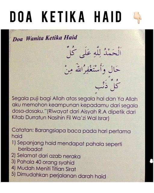 "Tidak ada seorang perempuan pun yg kedatangan haid, melainkan haidnya itu menghapuskan dosa-dosa yang telah lalu daripada segala dosa-dosanya dan sekiranya ia membaca doa diatas pada hari yang pertama, maka Allah SWT akan menulis baginya supaya terlepas daripada api neraka dan dapat lalu di atas jambatan Sirat dengan selamat dan aman daripada azab dan meninggikan derajatnya oleh Allah SWT baginya dengan tiap satu hari dan satu malam akan empat puluh orang mati syahid. manakala perempuan itu dikira berzikir kepada Allah SWT di dalam masa haidnya."