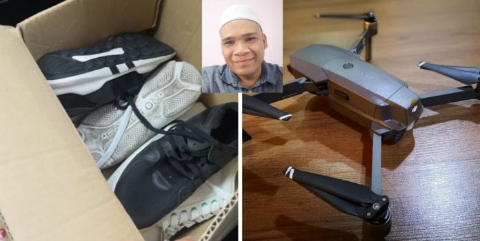 Asalnya dia mahu membeli drone terpakai berjenama Mavic Pro dan sudah lama mencarinya. Bermula dari tarikh barangan itu dipos pada 4 April lalu, drone itu hanya sampai ke tangannya pada 13 April. Mengejutkan, rasa teruja untuk membuka dan melihat barangan dibelinya pada harga RM2200 yang didapati bukan drone sebaliknya kasut buruk! Ya hanya kasut buruk dan bukan drone seperti dipersetujui penjual dan pembeli!