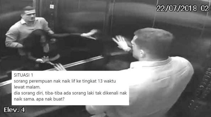 Seorang perempuan naik lif ke tingkat 13 waktu tengah malam. Dia seorang diri, tiba-tiba seorang lelaki tak dikenali naik sama. Apa nak buat?