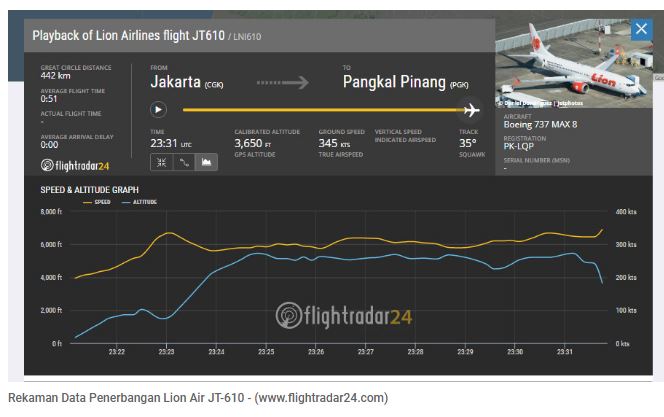 – Boeing 737 Max 8 ini baru diguna pada 15 Ogos 2018 untuk penerbangan pertama. Pesawat ini jatuh di perairan Karawang, Jawa Barat pada Isnin 29 Oktober pagi, 13 minit selepas berlepas dari Bandara Soekarno Hatta dalam penerbangan menuju Pangkal Pinang, Kepulauan Bangka Belitung pada jam 6.20 pagi.