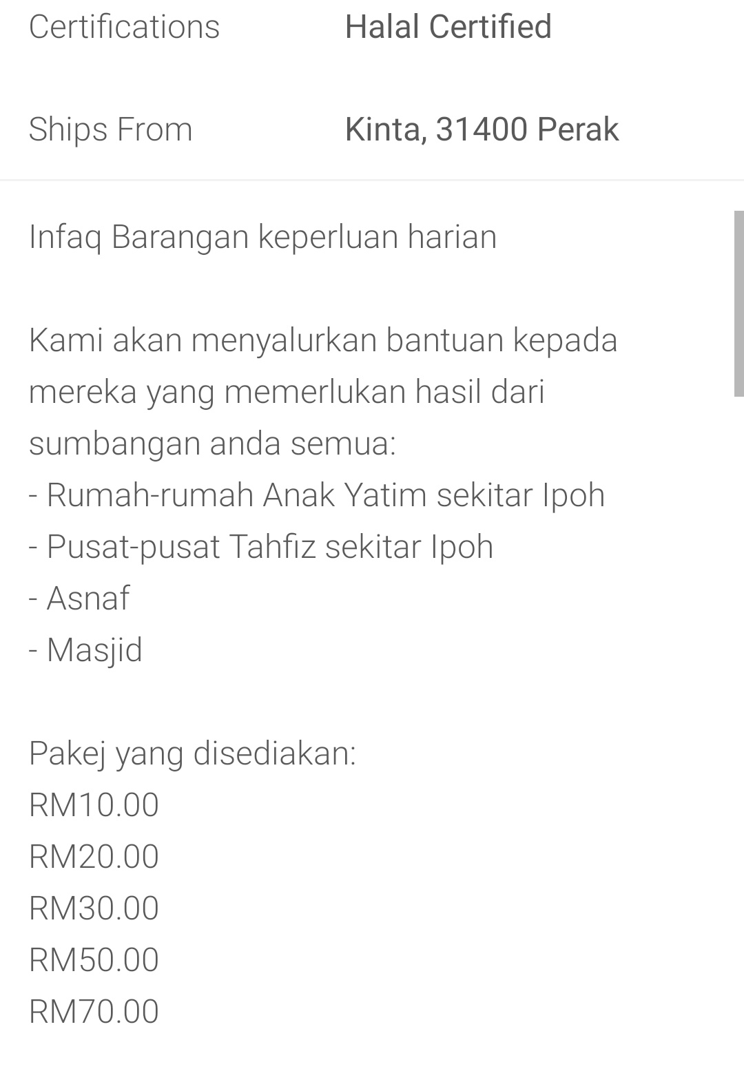 Kalau korang nak tahu, Shopee ada menjual set infaq yang berharga paling murah RM10. Kemudian, set ini akan diberikan terus ke rumah anak yatim, tahfiz, asnaf dan masjid.