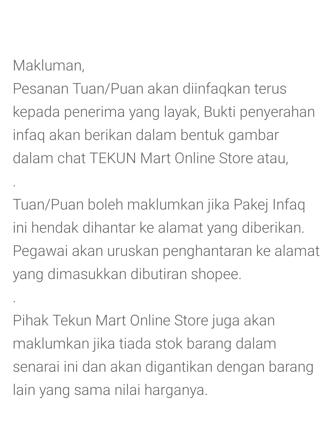 Ini pula set infaq atau nak hantar pada keluarga sendiri pun boleh. Ada beberapa set yang ditawarkan. Bagi penghantaran dengan tujuan infaq, mereka akan menghantar gambar bukti apabila barangan sudah diserahkan kepada penerima yang layak.