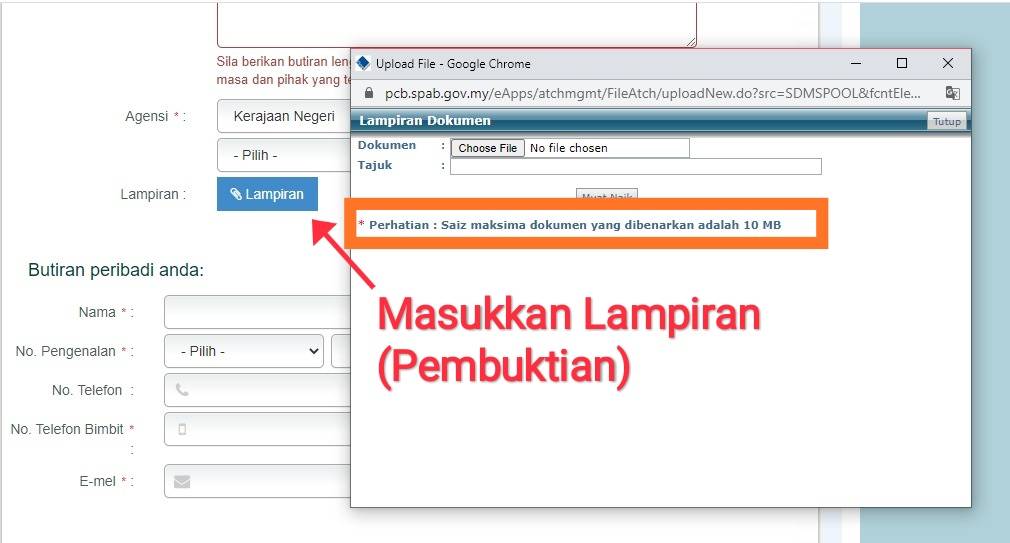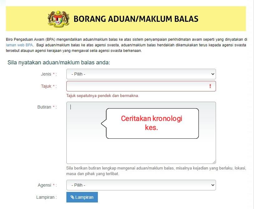 5) Isi borang aduan, masukkan tajuk sama ada aduan atau cadangan misalnya. Dibahagian butiran masukkan masa, tempat, tarikh dan nama anggota dan cerita sedikit kronologi cerita. Apa salah laku pegawai? Apa kejadiannya? Kemudian, masukkan juga lampiran bukti seperti dalam no.3 di atas (jika ada) dalam ruangan lampiran.