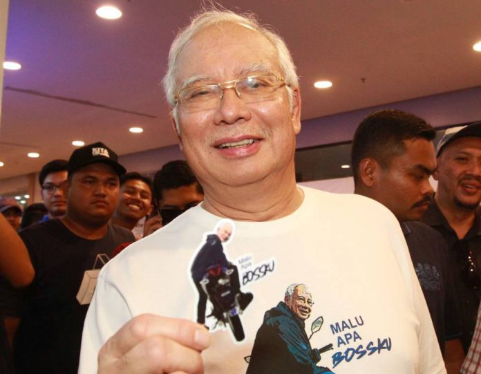 Datuk Seri Najib Razak showing his Malu Apa Bossku stickers during his campaigning for Semenyih by-election at Tesco Bandar Bukit Mahkota.