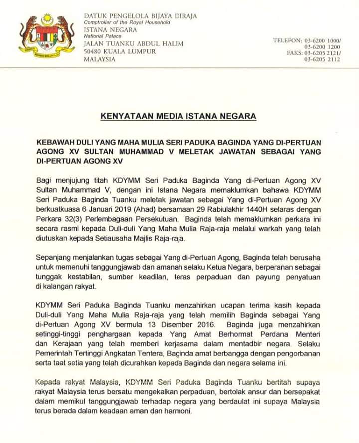 Secara rasminya pada 6 Januari 2019, KDYMM Seri Paduka Baginda Yang di-Pertuan Agong, Sultan Muhammad V telah meletakkan jawatan sebagai Yang di-Pertuan Agong ke-15.
