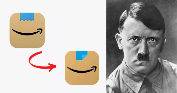 Dilancarkan pada Januari lalu, logo tersebut menampilkan tambahan imej pita pelekat berwarna biru di atas logo ‘senyum’ Amazon. Namun begitu, bentuk pita pelekat yang direka dengan garisan zig zag dikatakan mirip dengan misai pemimpin dictator Nazi tersebut.