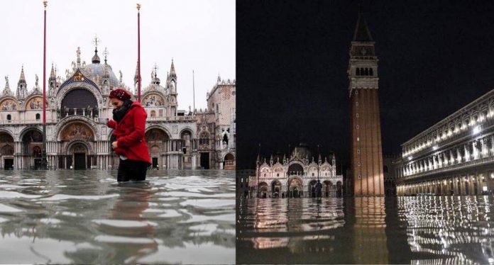 Dataran St Mark di Venice turut tenggelam akibat fenomena ‘acqua alta’ tersebut dan paras banjir mencecah sehingga 1.87 meter (m) hingga menyebabkan penggera amaran banjir terpaksa dibunyikan di bandar terapung tersebut.