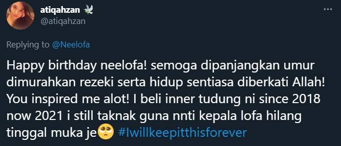 “Happy birthday Neelofa! Semoga dipanjangkan umur dimurahkan rezeki serta hidup sentiasa diberkati Allah! You inspire me a lot! I beli inner tudung ini sejak 2018. Hingga sekarang saya masih tidak mahu gunakannya, nanti kepala Lofa hilang tinggal muka je..” – @atiqahzan
