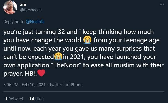 “Kamu baru berusia 32 tahun dan saya selalu terfikir betapa luas perubahan yang telah kamu lakukan kepada dunia. Sejak dari usia remaja hinggalah sekarang, setiap tahun kamu telah memberikan kami kejutan yang tidak disangka-sangka. Untuk tahun 2021, kamu telahpun melancarkan aplikasi The Noor untuk menyenangkan pula cara muslim menunaikan solat.” – @fieshaaaa