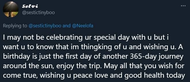 “Mungkin saya tidak menyambut hari istimewa ini bersama Neelofa. Tapi saya cuma hendak dia tahu bahawa saya selalu teringatkan dia dan berharap (perkara yang baik-baik) untuknya. Hari kelahiran hanyalah hari pertama daripada perjalanan 365 hari setahun, jadi nikmatilah setahun yang akan datang ini. Semoga segala perkara yang diharapkan oleh kamu tercapai dan sentiasa sihat selalu. – @sestictinyboo