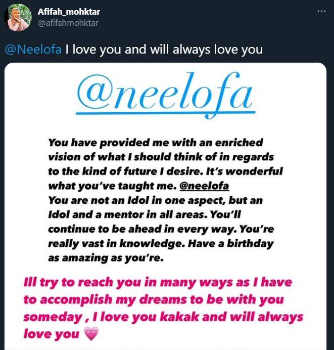 “Kepada Neelofa, kamu telah memberikan saya pandangan yang lebih jelas mengenai apa yang saya inginkan untuk masa depan saya. Segala tunjuk ajar yang saya perolehi dari kamu amatlah bermakna. Kamu bula hanya idola saya dalam satu aspek saja, kamu juga mentor saya dari semua segi. Kamu akan terus ke hadapan dalam semua bidang. I love you kakak and will always love you.” – @afifahmokhtar