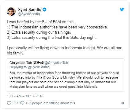 Dalam pada itu, Menteri Belia dan Sukan, YB Syed Saddiq Abdul Rahman telah memuat naik tweet mengenai insiden ini dan telahpun dimaklumkan mengenainya. Beliau turut berkata akan terbang ke Indonesia hari ini untuk memastikan sekuriti pasukan bola sepak Malaysia berada dalam tahap terbaik semasa perlawanan akhir esok.