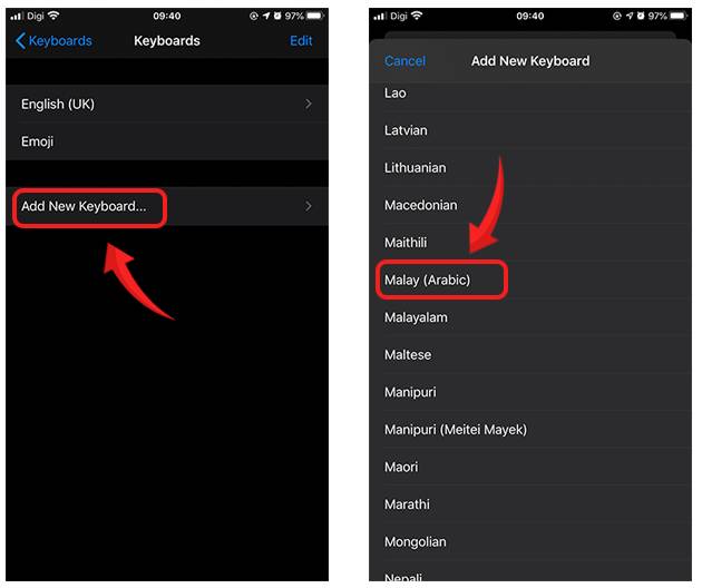 Kemudian, tekan pada Add New Keyboard dan pilih Malay (Arabic)