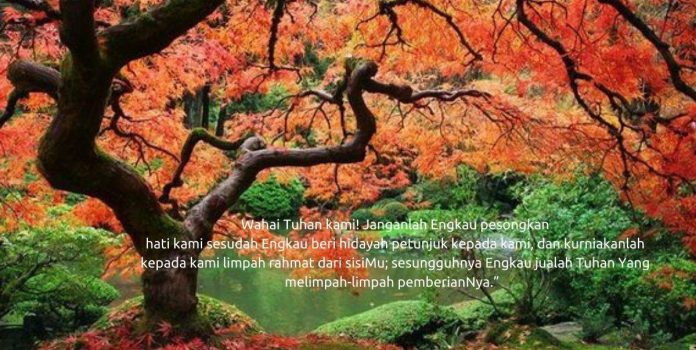 “"Wahai Tuhan kami! Janganlah Engkau pesongkan hati kami sesudah Engkau beri hidayah petunjuk kepada kami, dan kurniakanlah kepada kami limpah rahmat dari sisiMu; sesungguhnya Engkau jualah Tuhan Yang melimpah-limpah pemberianNya.”