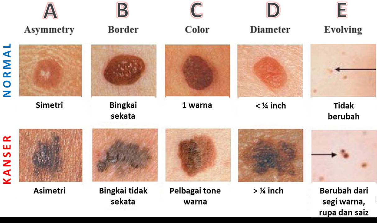 A – asymmetry – Selalunya tahi lalat yang disebabkan kanser melanoma adalah tidak simetri (asimetri). Iaitu ada kawasan yang besar dan ada kawasan yang kecil. B – Border(sempadan) – Sempadan kanser melanoma pula tidak sekata tidak sama seperti tahi lalat biasa. C – Colour(Warna) – Warna tahi lalat tersebut juga tidak sekata. Ada yang berwarna cerah. Dan ada yang berwarna gelap D – Diameter – Diameter melanoma akan sentiasa bertambah hari demi hari E – Evolving(Berubah) – Waspada dengan sebarang perubahan pada tahi lalat anda daripada segi warna, saiz dan sempadannya. Syak sebagai melanoma jika berlakunya sebarang perubahan