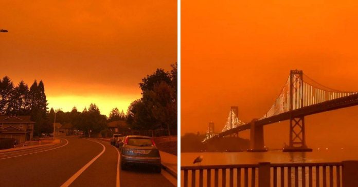 Telah tular gambar di media sosial masyarakat di AS menyaksikan langit berwarna oren disebabkan oleh asap kebakaran hutan yang menghalang sinaran cahaya matahari.