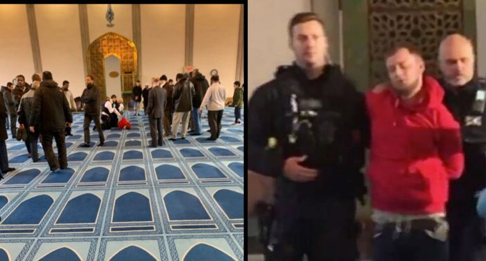 Gambar-gambar yang dikongsi di media sosial dari dalam masjid di Regent’s Park menunjukkan seorang lelaki kulit putih berbaju merah ditahan dan digari oleh pegawai polis.
