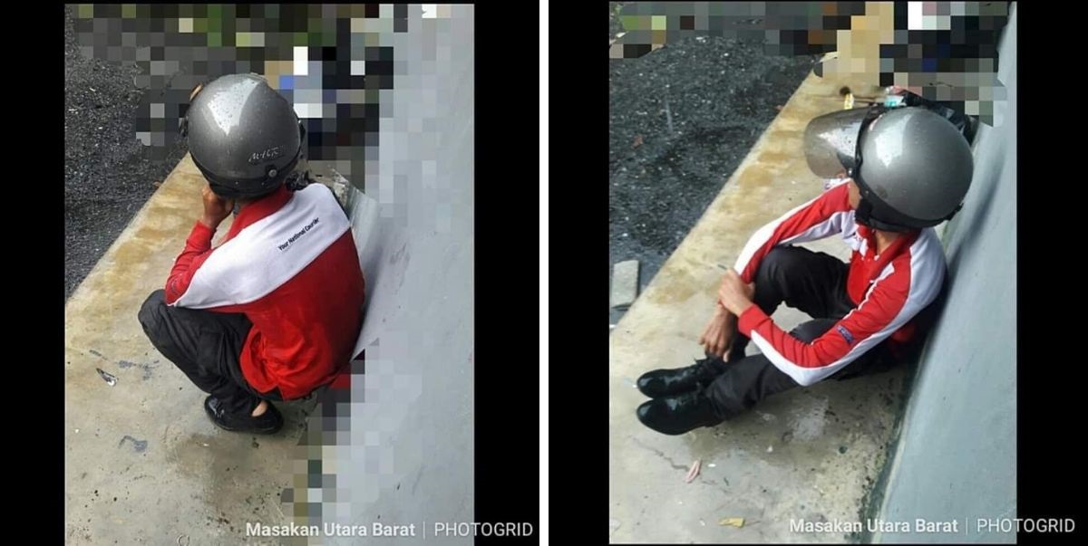 Tadi lepas abang Posmen ni selesai hantar surat dan barang yg aku beli online tu, ada org call dia,l epas jawab call tu dia terus duduk termenung di situ dalam keadaan basah lencun.