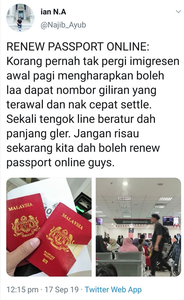 Jabatan Imigresen Malaysia juga menyarankan agar orang ramai memperbaharui passport mereka secara online tanpa perlu ke kaunter.