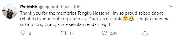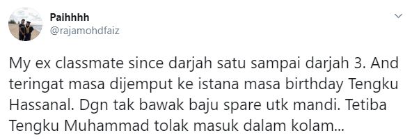 Dikenali sebagai Raja Mohd Faiz, jelasnya dia merupakan bekas rakan sekelas kepada Tengku Hassanal ketika di sekolah rendah. Perkongsian ini menjadi viral apabila mendapat lebih daripada 25 ribu tanda suka dan hampir 13 ribu retweets.