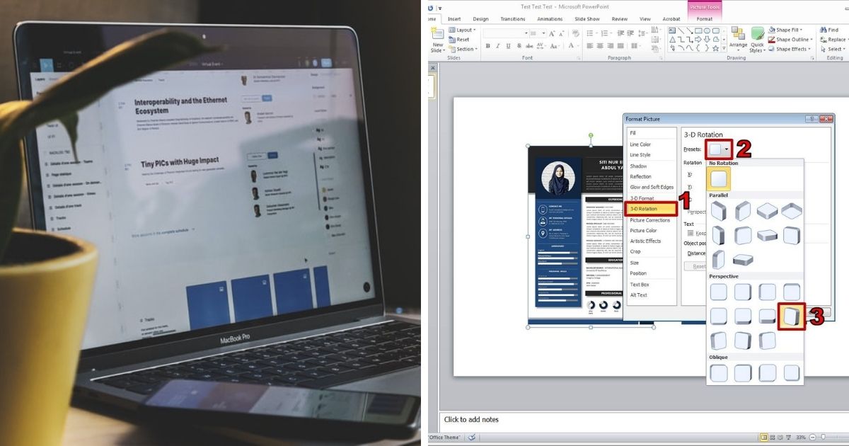 Klik 3D rotation, klik presets, klik perspective yang sesuai.