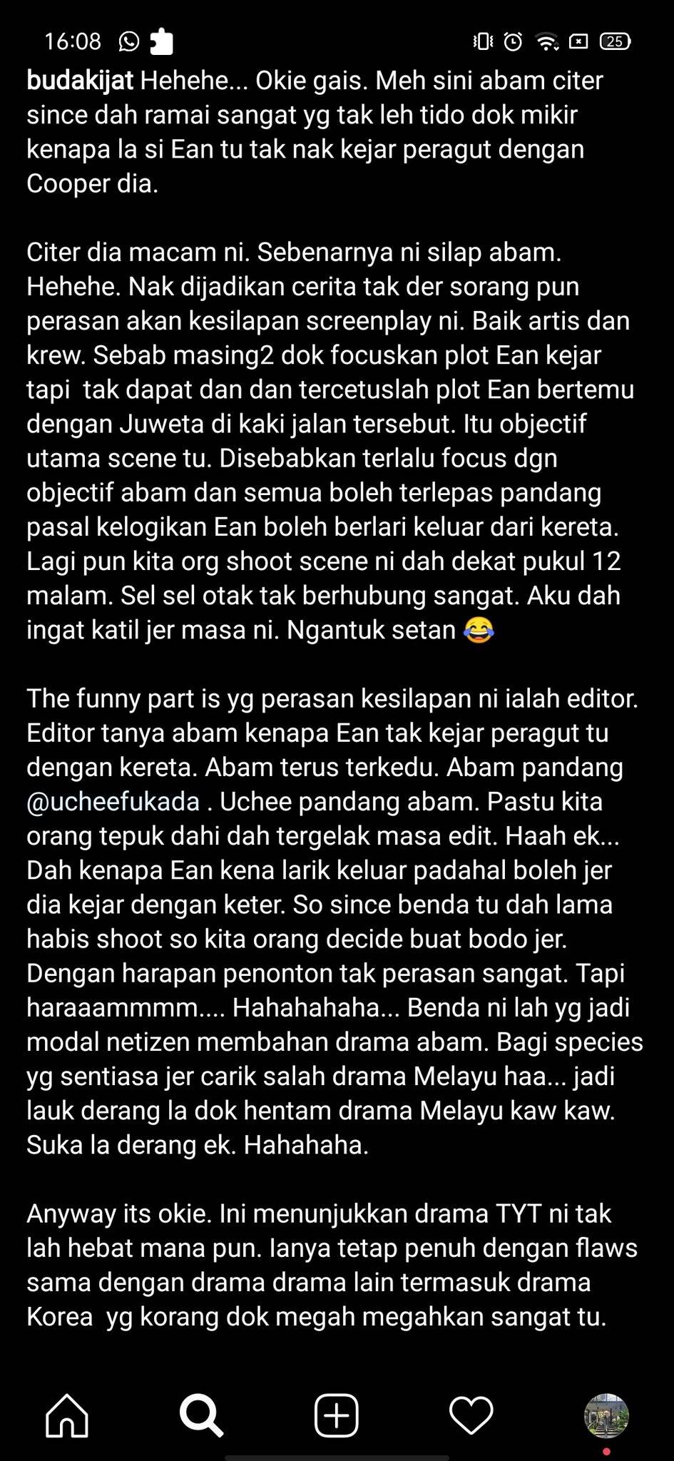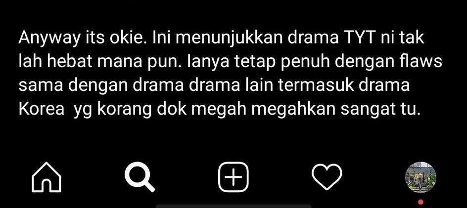 “It is okay. Ini menunjukkan drama Takdir Yang Tertulis ini tidaklah hebat mana pun. Ia tetap penuh dengan kesilapan sama dengan drama-drama lain termasuklah drama Korean yang korang megah-megahkan sangat tu,” catatnya.