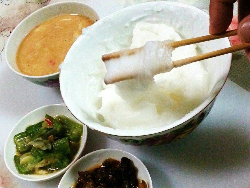 “Dengan sukatan air panas, tepung sagu berkenaan dikacau hingga menjadi kenyal. Ia berwarna jernih dan sedikit melekit. Tidak perlu dikunyah dan boleh terus ditelan. Rasanya tawar, namun ia bergantung pada kuah dan lebih hebat jika kuah lebih masam atau pedas,”