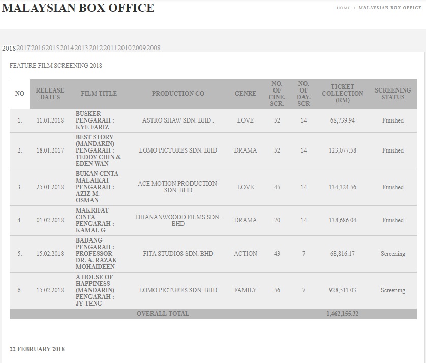 Bermula dari Januari hingga Mac 2018, sebanyak 6 buah filem sudah memasuki pawagam bermula dari 11 Januari lalu menerusi filem Buskres yang dilakonkan oleh Hafeez Mikhail, Daiyan Trisha, Anas Ridzuan, Stephanie Jessica Terry, Mas Khan, Lia Natalia, Loque dan Elizabeth Tan dengan genre romantik/ muzikal yang dijangka mampu menarik minat orang muda ternyata gagal.
