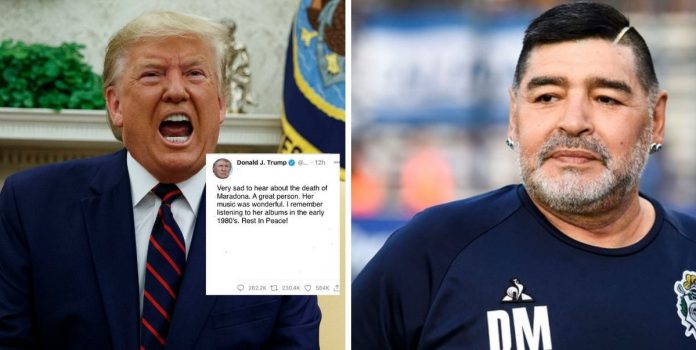 Dalam tweetnya, Trump menyatakan “Very sad to hear about the death or Maradona. A great person. Her music was wonderful. I remember listening to her albums in the early 1980’s. Rest In Peace”