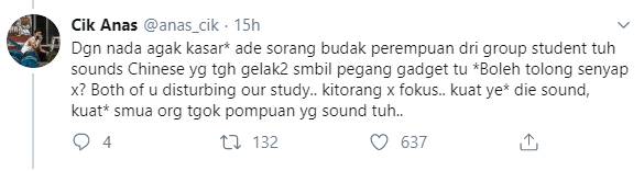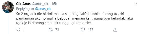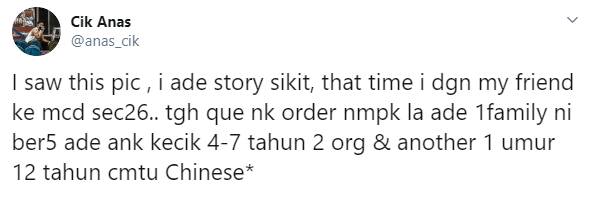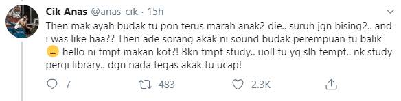 Dan apa yang berlaku baru-baru ini, atas perkongsian Cik Anas di laman twitternya, sekumpulan pelajar bertindak memarahi anak kecil yang bising di restoran makanan tersebut.