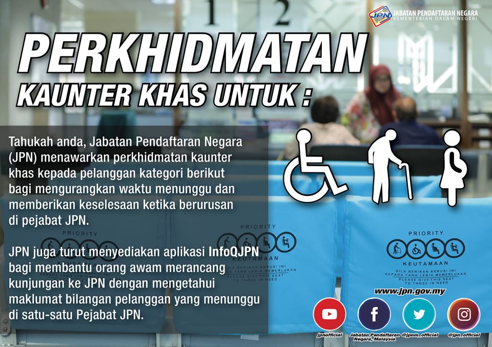 JPN ada menyediakan kaunter perkhidmatan khas bagi pelanggan kami di bawah kategori warga emas, Orang Kurang Upaya dan ibu mengandung sekiranya datang berurusan di JPN. Petugas kaunter kami akan menawarkan pelanggan kategori ini ke kaunter khas yang disediakan.