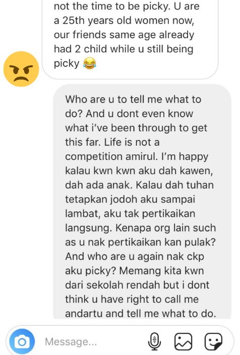 “Dan siapa kau untuk menuduh aku memilih. Kita memang berkawan sejak sekolah rendah tetapi kau tak ada hak untuk memanggil aku andartu.”